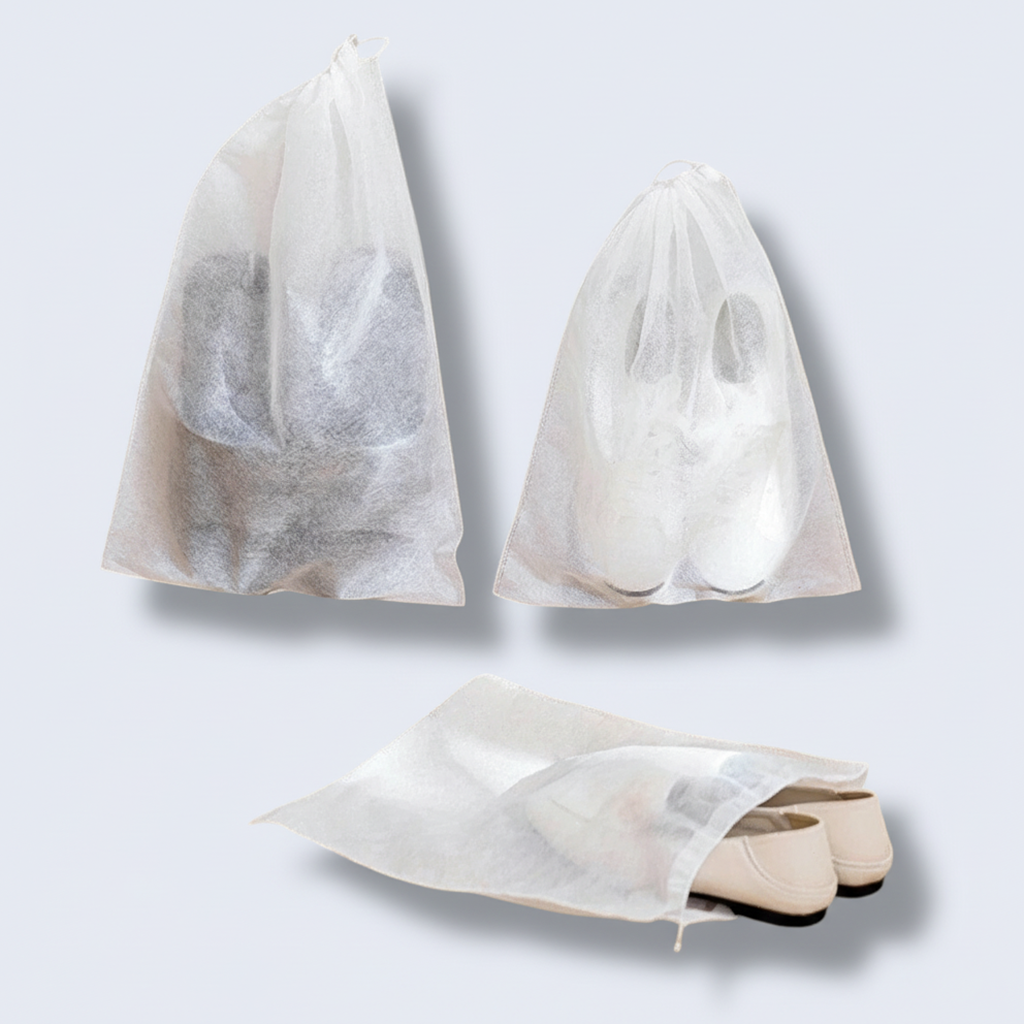 Lightweight, breathable bags made from semi-transparent non-woven fabric featuring a simple drawstring closure. Perfect for shoe storage, travel packing, and protecting retail accessories.